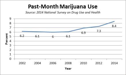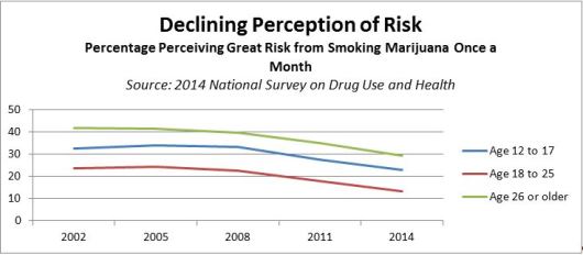 Social acceptance of marijuana may be increasing because fewer people see great risk associated with using it. In 2002, 38 percent of Americans age 12 and over saw great risk in using the drug once a month. In 2014, that number had fallen to 26.5 percent. These relaxed attitudes toward marijuana use come at a time when the drug is more potent than ever. In the 1970s, marijuana had a content of THC (marijuana's active ingredient) of about 1 percent. Today, THC content is nearly 13 percent, and some strains are advertised as having a THC content of around 25 percent or higher.