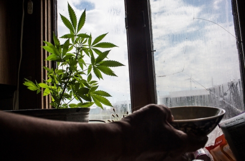 A marijuana plant is grown in window sill of a Yupik family on July 3, 2015, in Newtok, Alaska.